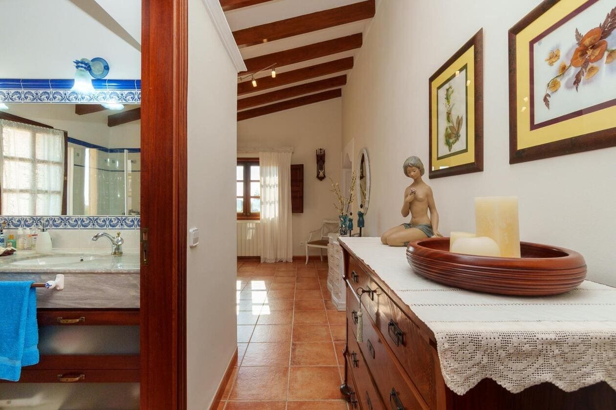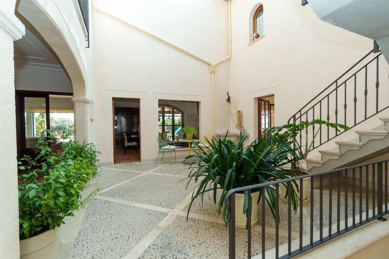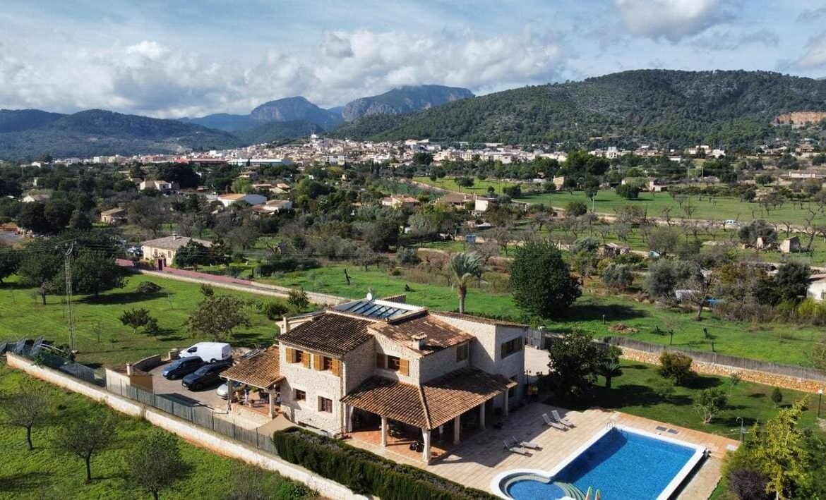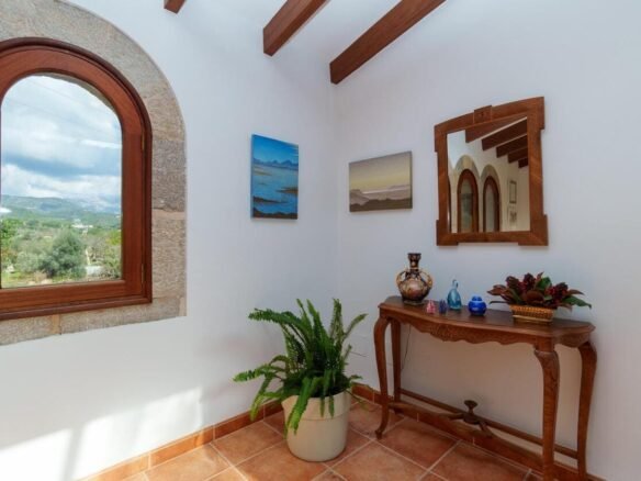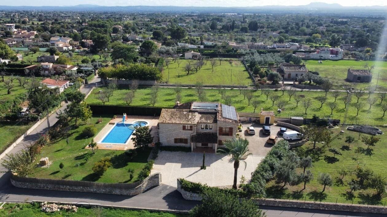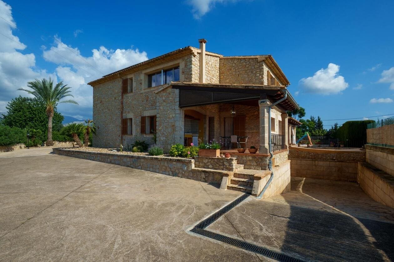 Espectacular Vivienda con Encanto Mallorquín, Piscina y Vistas a la Tramuntana..Se vende magnífica propiedad de 414,44 m² construidos en dos plantas, ubicada en una tranquila zona rural entre Inca y Lloseta, a pocos kilómetros de la autopista y con acceso por camino asfaltado. Construida en 1999 con materiales de alta calidad, combina el estilo tradicional mallorquín con todas las comodidades modernas...Distribución:..Planta sótano: Garaje cerrado con capacidad para dos vehículos, con escalera interior de acceso a la planta principal...Planta baja: Recibidor, cocina independiente, un baño completo, un dormitorio, sala de estar, y un amplio comedor con chimenea y vistas directas al patio central y a la piscina..El corazón de la vivienda es un auténtico patio mallorquín de guijarros, de 30 m², cubierto por un lucernario que baña de luz natural toda la casa, creando un ambiente acogedor y único...Planta superior: Cuatro dormitorios y dos baños completos. Todas las habitaciones se comunican a través de un amplio distribuidor con vistas al patio central, destacando los ventanales de piedra con espectaculares vistas a la Sierra de Tramuntana y a la piscina...Características destacadas:..Parcela rectangular de 6.000 m², totalmente cercada, con árboles frutales y amplias zonas exteriores...Piscina salina de 72 m² (6x12) con zona de terraza...Zona trasera pavimentada con capacidad para aparcar hasta 15 vehículos...Entrada con puerta automática, portero automático y suelo exterior de piedra mallorquina...Aislamiento excelente gracias al uso de termoarcilla, fachada de piedra natural, forjado sanitario de 80 cm, y ventanas Climalit de doble cristal con carpintería de teca...Calefacción por gasoil en toda la casa y aire acondicionado en comedor y sala de estar...Sistema de energía con placas solares, toda la propiedad funciona con electricidad, excepto la barbacoa (gas)...Internet fibra óptica, tomas de TV en toda la vivienda...Agua potable del pueblo con sistema de filtrado por sal + conexión independiente para riego...Aljibe de 50 toneladas para almacenamiento de agua potable...Esta vivienda es ideal para quienes buscan privacidad, confort y un estilo de vida mediterráneo auténtico, rodeado de naturaleza pero con fácil acceso a servicios y comunicaciones...¡Una oportunidad única de vivir en una casa con alma mallorquina y prestaciones de primer nivel!
